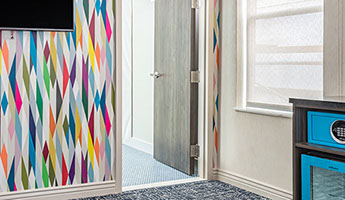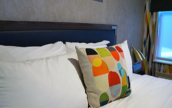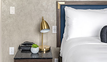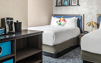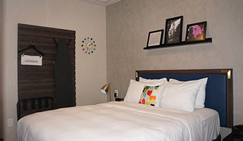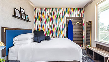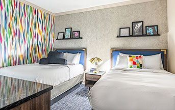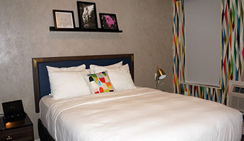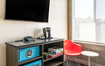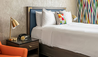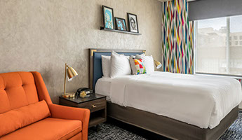 Enjoy comfort at its' finest in our queen room which has an additional bonus of a sleeper chair. This retro modern room has a colorful, trendy decor with all the latest amenities and convenience of your home away from home.