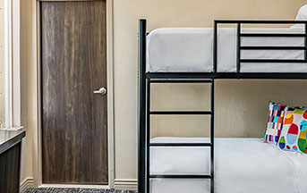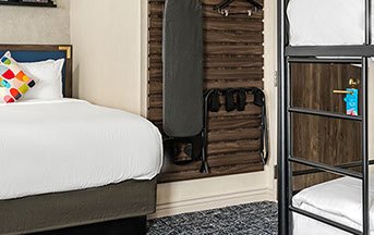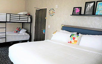 Our Family or Friends room provides one King Bed and one Bunk Bed. You will be delighted with the retro modern ambiance and the colorful, trendy decor. Our furnishings provide all the latest in amenities and convenience.